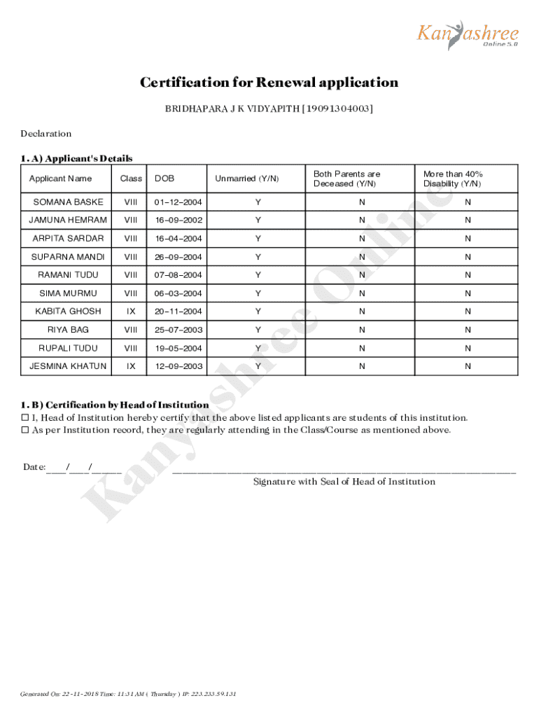 Certification for Renewal application BRIDHAPARA J K VIDYAPITH [19091304003] Declaration 1. A) Applicant\'s Details Unmarried (Y/N)SOMANA BASKEVIII01122004YJAMUNA HEMRAMVIII16092002YARPITA SARDARVIII16042004YSUPARNA