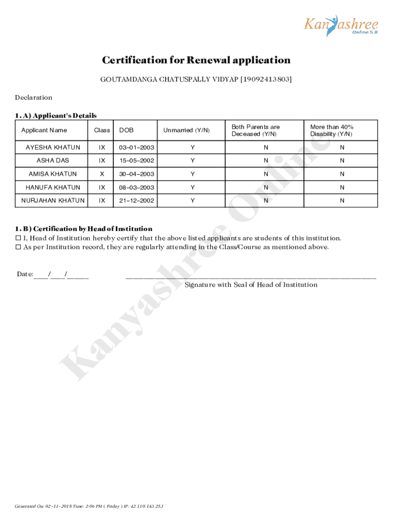 Certification for Renewal application GOUTAMDANGA CHATUSPALLY VIDYAP [19092413803] Declaration 1. A) Applicant\'s Details Unmarried (Y/N)AYESHA KHATUNIX03012003YASHA DASIX15052002YAMISA KHATUNX30042003YHANUFA