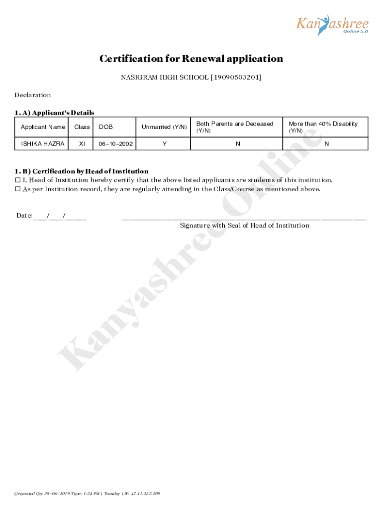 Certification for Renewal application NASIGRAM HIGH SCHOOL [19090503201] Declaration 1. A) Applicant\'s Details ClassISHIKA HAZRAXIDOBUnmarried (Y/N) YNMore than 40% Disability (Y/N) Nin06102002Both