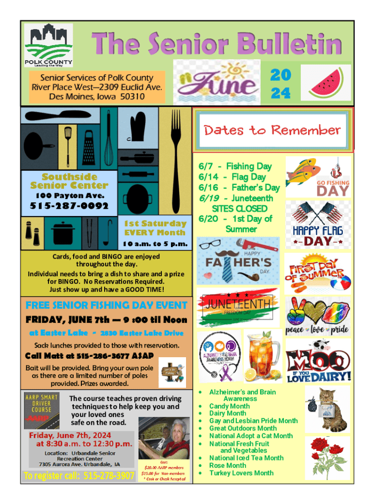 The Senior Bulletin 20Senior Services of Polk County River Place West2309 Euclid Ave. Des Moines, Iowa 50310Southside Senior Center 100 Payton Ave.5152870092 1st Saturday EVERY Month246/7 Fishing