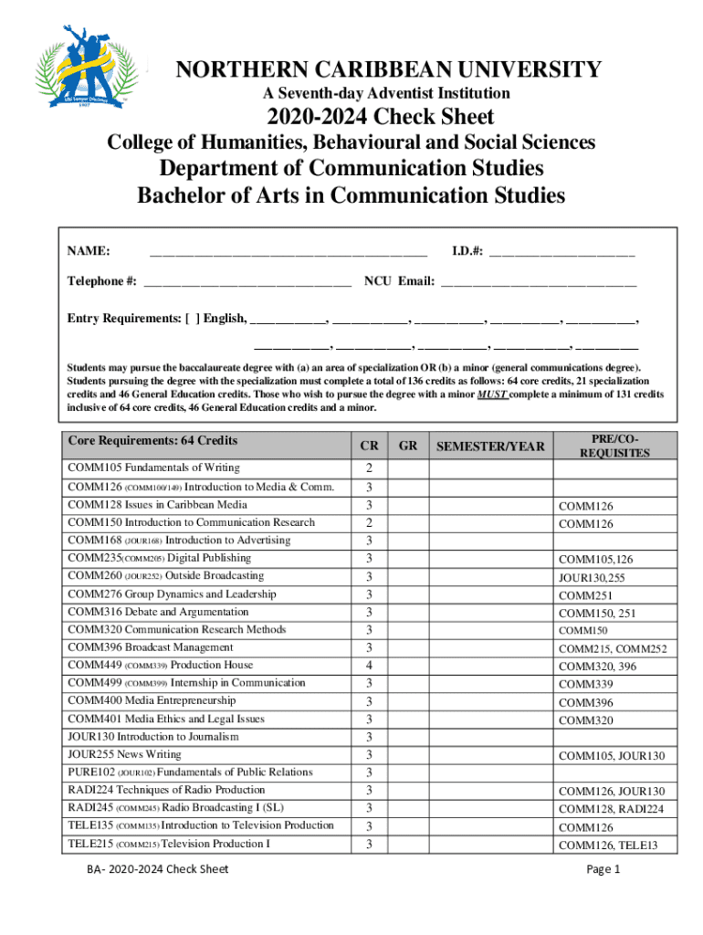 NORTHERN CARIBBEAN UNIVERSITY A Seventh day Adventist Institution20202024 Check Sheet College of Humanities, Behavioral and Social SciencesDepartment of Communication Studies Bachelor of Arts in Communication