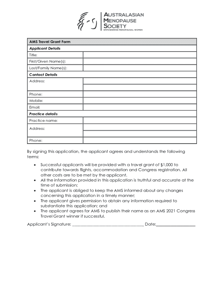 AMS Travel Grant Form Applicant Details Title: First/Given Name(s): Last/Family Name(s): Contact Details Address: Phone: Mobile: Email: Practice details Practice name: Address: Phone:By signing this