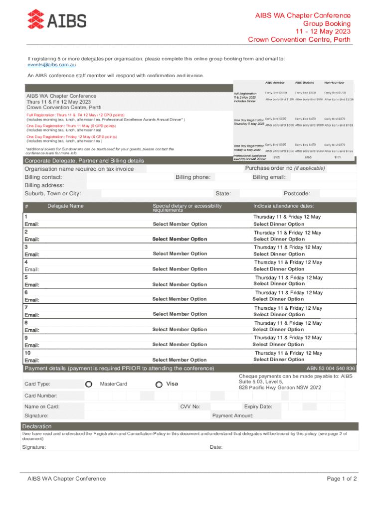 AIBS WA Chapter Conference Group Booking 11 12 May 2023 Crown Convention Centre, Perth If registering 5 or more delegates per organisation, please complete this online group booking form and email