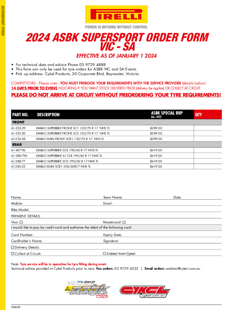 SUPERSPORT TYRES2024 ASBK SUPERSPORT ORDER FORM VIC SA EFFECTIVE AS OF JANUARY 1 2024 For technical data and advice Phone 03 9729 4888 This form can only be used for tyre orders for ASBK VIC and SA