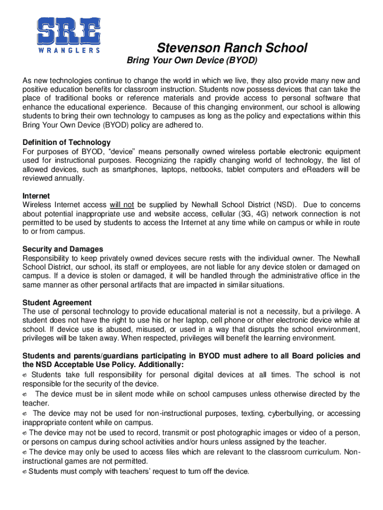 Stevenson Ranch School Bring Your Own Device (BYOD) As new technologies continue to change the world in which we live, they also provide many new and positive education benefits for classroom instruction.