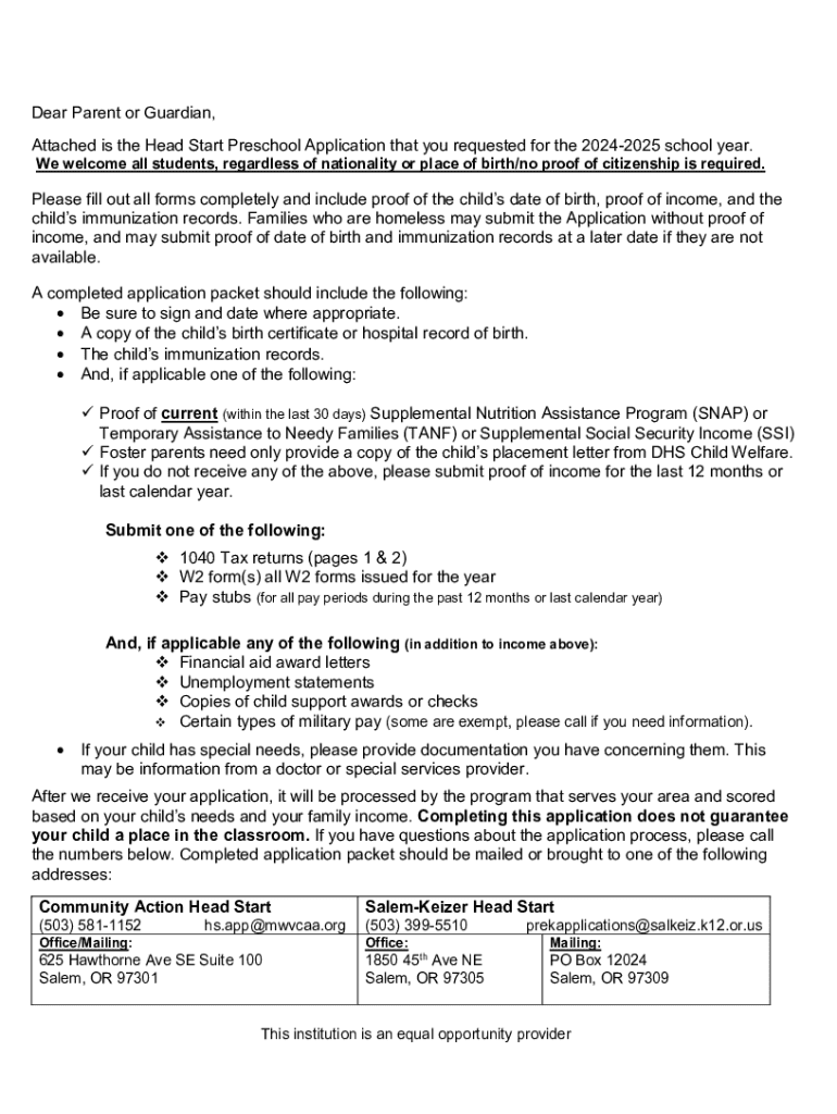 Dear Parent or Guardian, Attached is the Head Start Preschool Application that you requested for the 20242025 school year. We welcome all students, regardless of nationality or place of birth/no proof