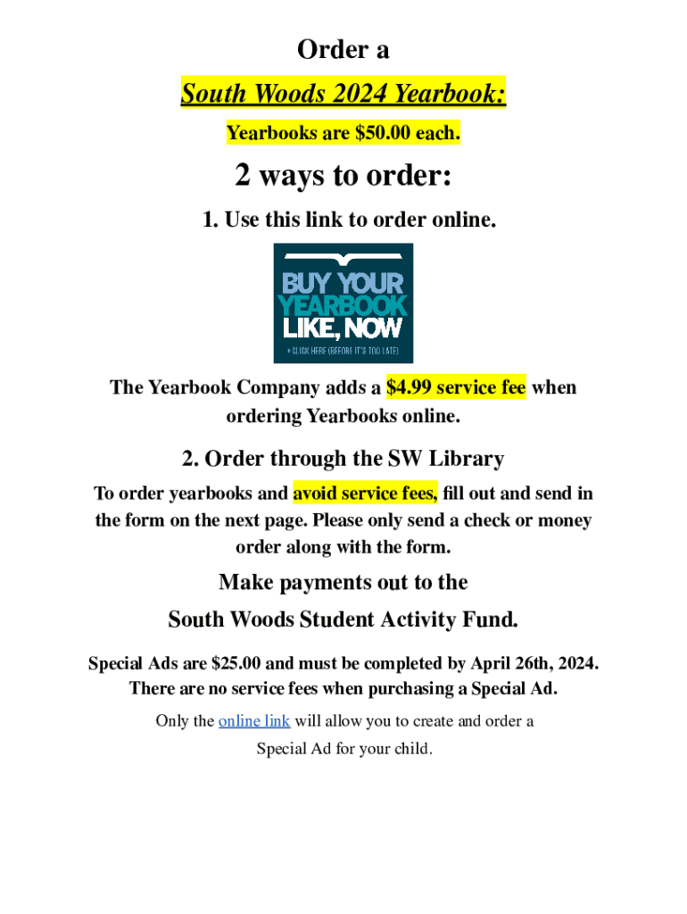 Order a South Woods 2024 Yearbook: Yearbooks are $50.00 each.2 ways to order: 1. Use this link to order online. The Yearbook Company adds a $4.99 service fee when ordering Yearbooks online.2. Order