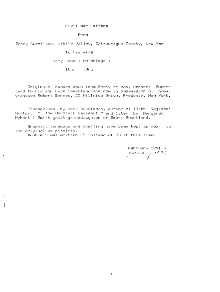 Civil War Letters Emory Sweet land, Little Valley, Cattauragus County New York