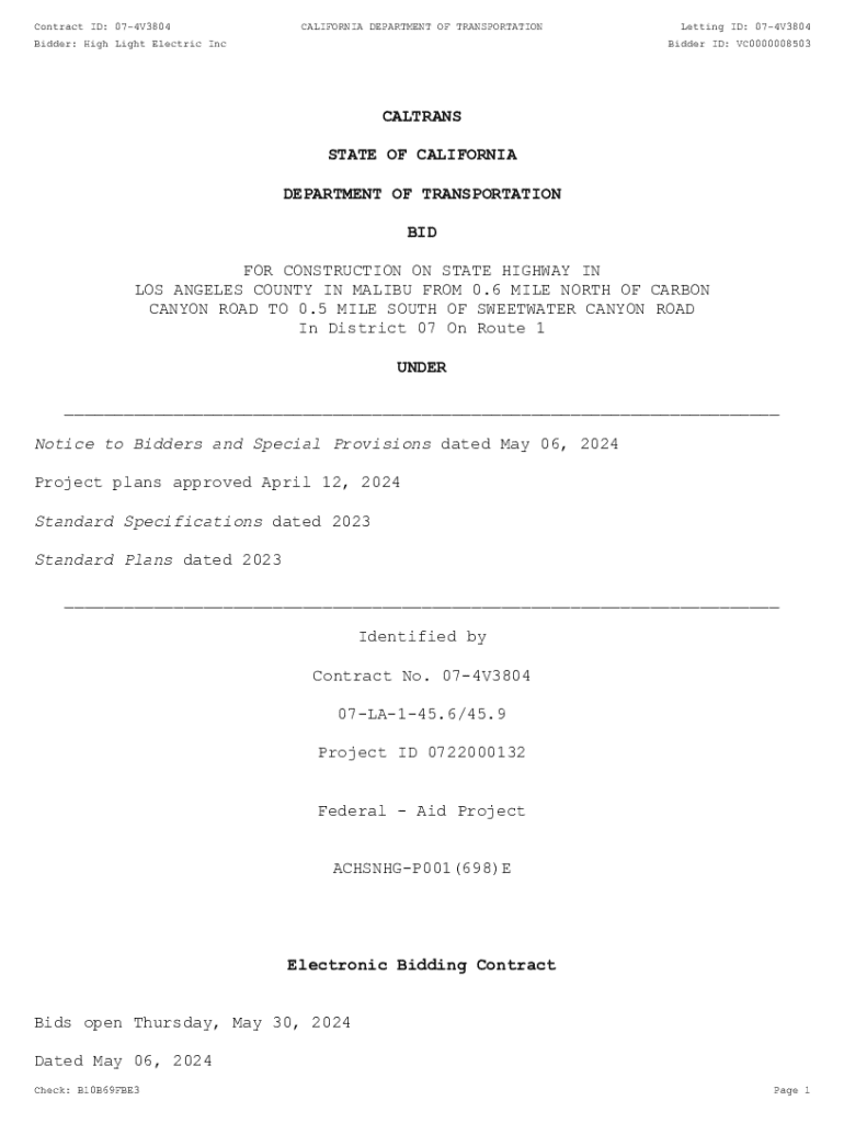 Contract ID: 074V3804CALIFORNIA DEPARTMENT OF TRANSPORTATIONBidder: High Light Electric IncLetting ID: 074V3804