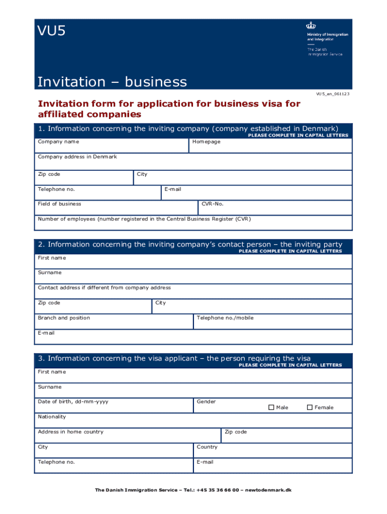 VU5 Invitation business VU5_en_061123Invitation form for application for business visa for affiliated companies 1. Information concerning the inviting company (company established in Denmark)PLEASE