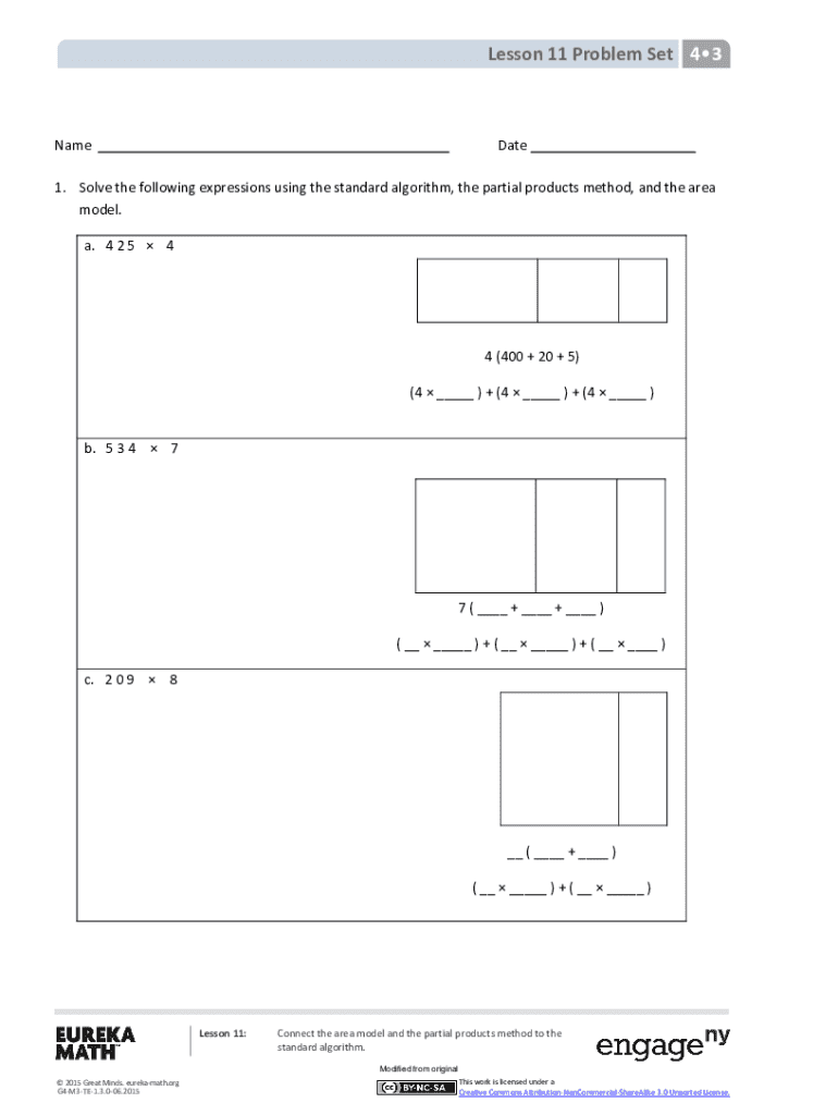 Lesson 11 Problem Set 4 3NameDate1. Solve the following expressions using the standard algorithm, the partial products' method, and the area