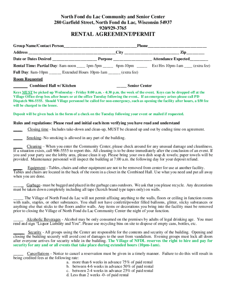 North Fond du Lac Community and Senior Center 280 Garfield Street, North Fond du Lac, Wisconsin 54937 920/9293765RENTAL AGREEMENT/PERMIT Group Name/Contact Person___Phone___ Address ___City ___ Zip___