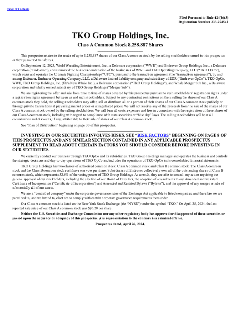 Table of ContentsFiled Pursuant to Rule 424(b)(3) Registration Number 333274541 TKO Group Holdings, Inc. Class Common Stock 8,258,887 Shares This prospectus relates to the resale of up to 8,258,887