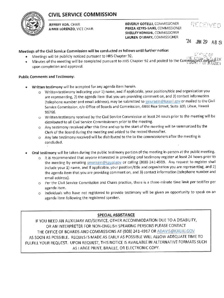 COUNTY OF KAUAI Minutes of Meeting OPEN Session)Board/Commission: CIVIL SERVICE COMMISSION Meeting Date: January 2, 2024, Location Boards and Commissions Conference Room Start of Meeting: 3:00 p.m.