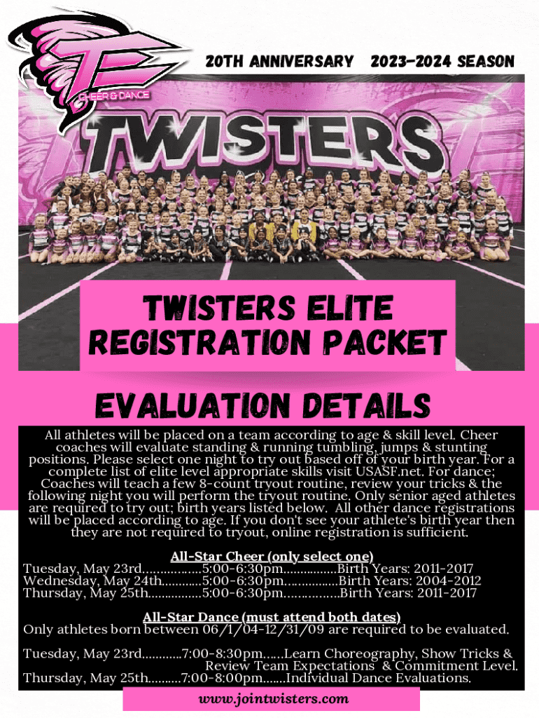 20TH ANNIVERSARY 20232024 SEASONTWISTERS ELITE REGISTRATION PACKET EVALUATION DETAILS All athletes will be placed on a team according to age & skill level. Cheer coaches will evaluate standing & running