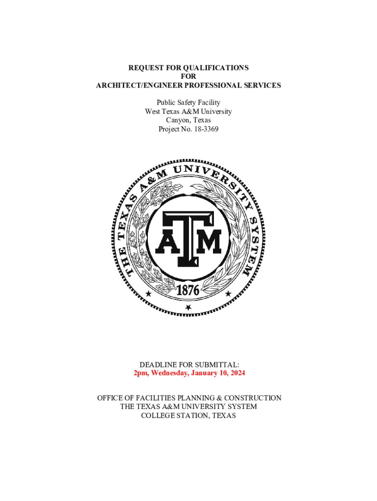 REQUEST FOR QUALIFICATIONS FOR ARCHITECT/ENGINEER PROFESSIONAL SERVICES Public Safety Facility West Texas A&M University Canyon, Texas Project No. 183369DEADLINE FOR SUBMITTAL: 2pm, Wednesday, January