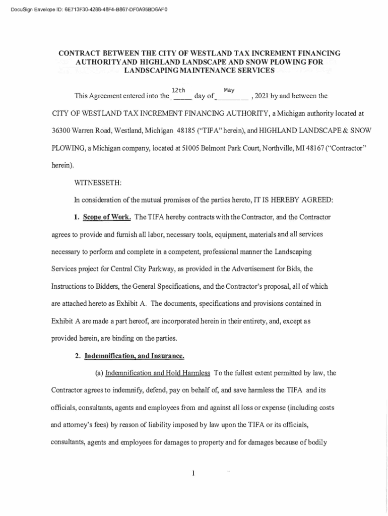 DocuSign Envelope ID: 6E713F30428848F4B867DF0A95BD6AF0CONTRACT BETWEEN THE CITY OF WESTLAND TAX INCREMENT FINANCING AUTHORITY AND HIGHLAND LANDSCAPE AND SNOW PLOWING FOR LANDSCAPING MAINTENANCE SERVICES