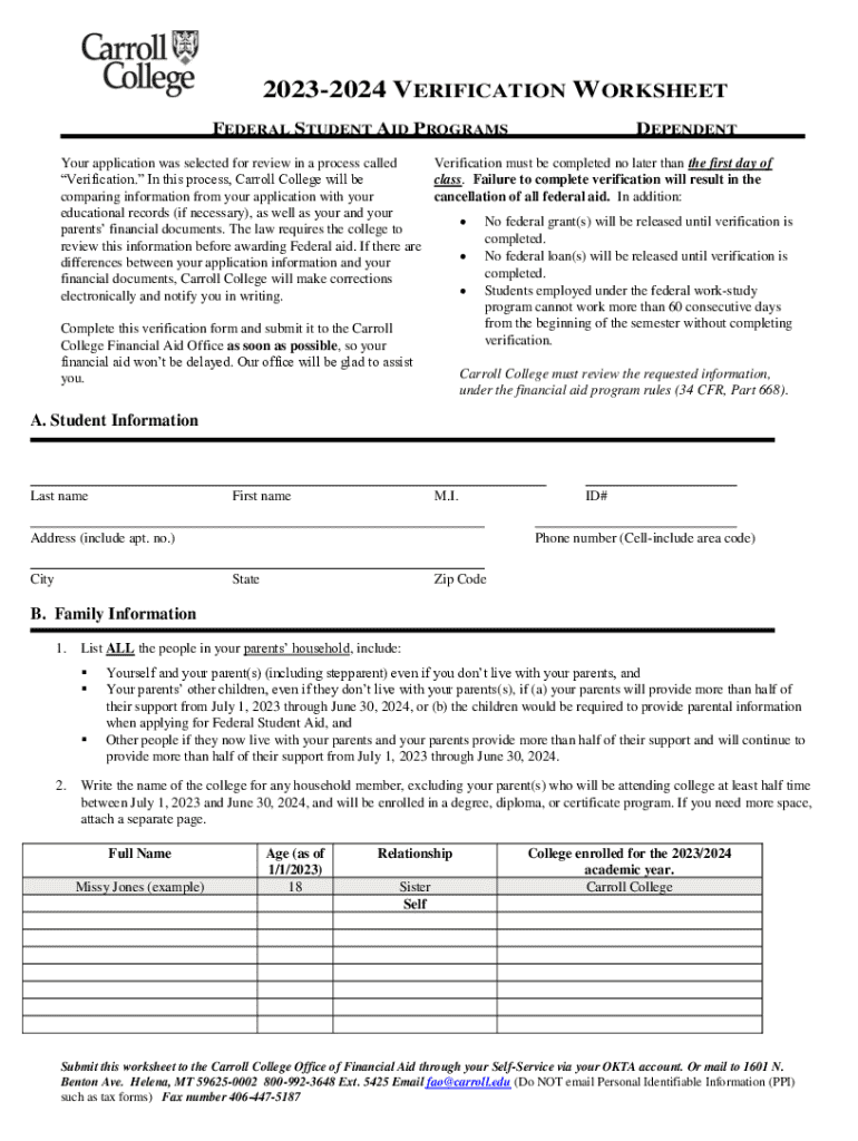 20232024 VERIFICATION WORKSHEET FEDERAL STUDENT AID PROGRAMSDEPENDENTYour application was selected for review in a process called Verification must be completed no later than the first day of Verification.