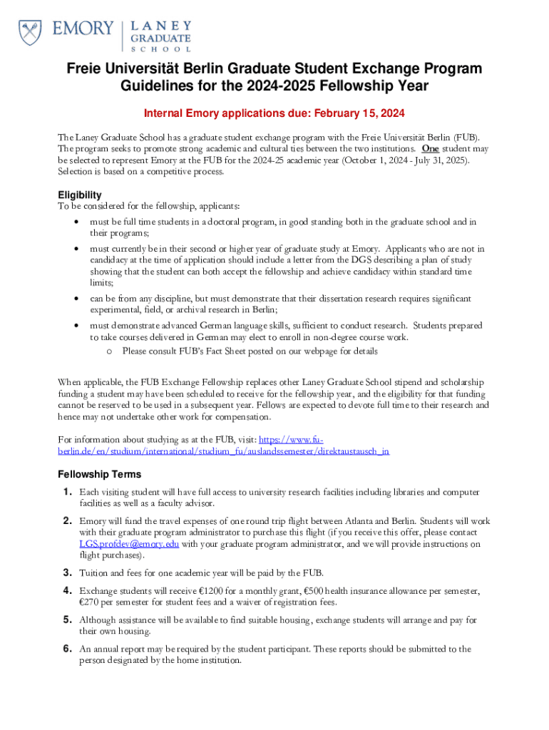 Free University Berlin Graduate Student Exchange Program Guidelines for the 20242025 Fellowship Year Internal Emory applications due: February 15, 2024, The Lana Graduate School has a graduate student