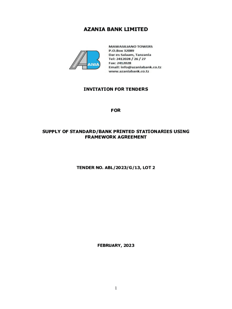 Get the free invitation for tenders for supply of standard/bank printed stationaries ... - azania...