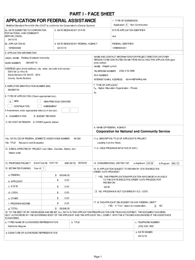 Application Modified Standard Form 424 (Rev.02/07 to confirm to the Corporation\'s grants System)