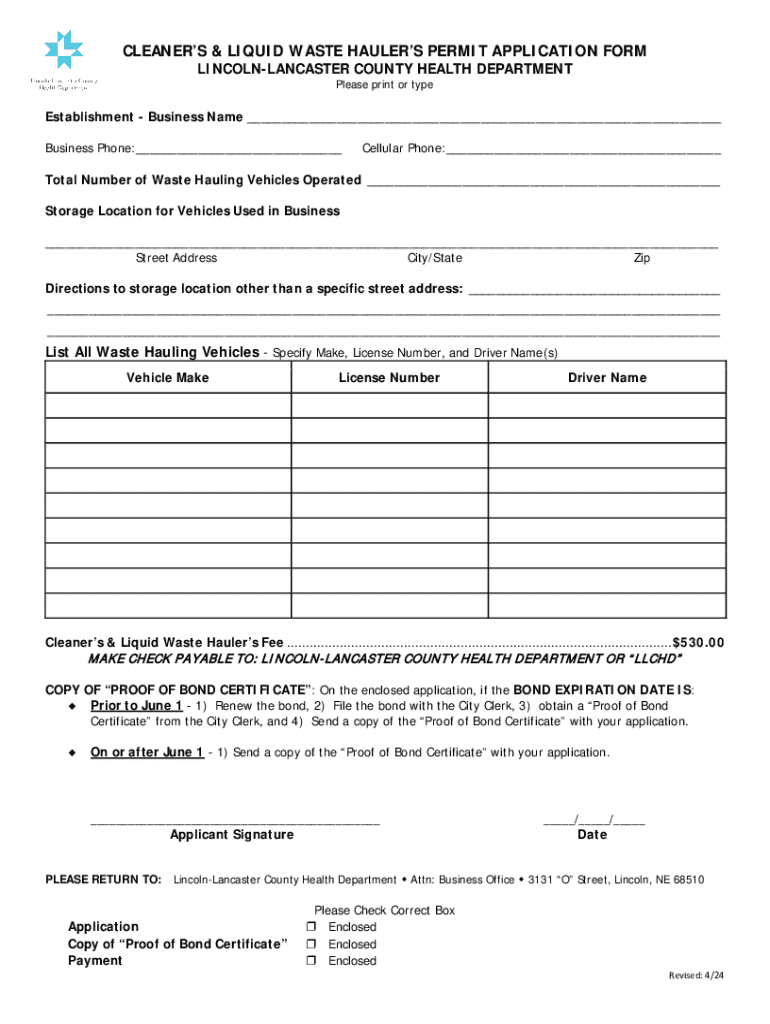 CLEANERS & LIQUID WASTE HAULERS PERMIT APPLICATION FORM LINCOLNLANCASTER COUNTY HEALTH DEPARTMENT Please print or typeEstablishment Business Name ___ Business Phone:___Cellular Phone:___Total Number