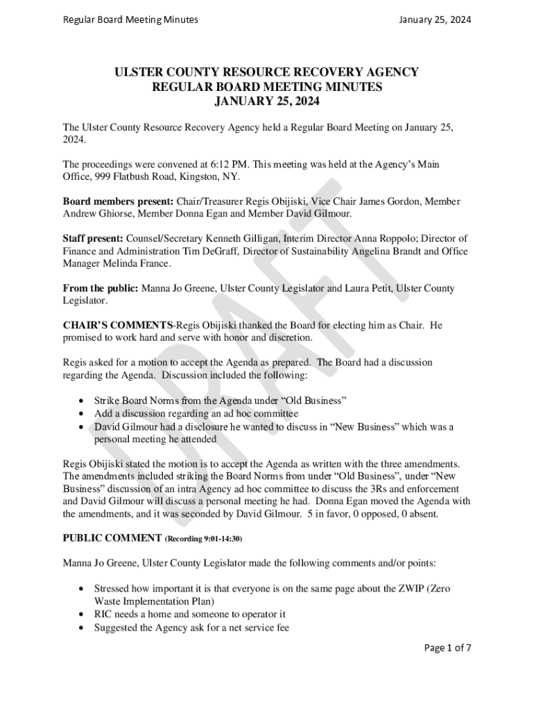 Regular Board Meeting Minutes January 25, 2024ULSTER COUNTY RESOURCE RECOVERY AGENCY