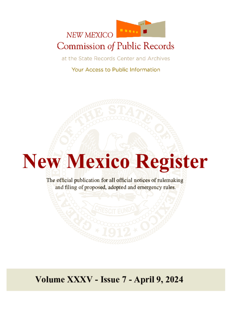 New Mexico Register The official publication for all official notices of rulemaking and filing of proposed, adopted and emergency rules.Volume XXXV Issue 7 April 9, 2024COPYRIGHT 2024 BY THE STATE