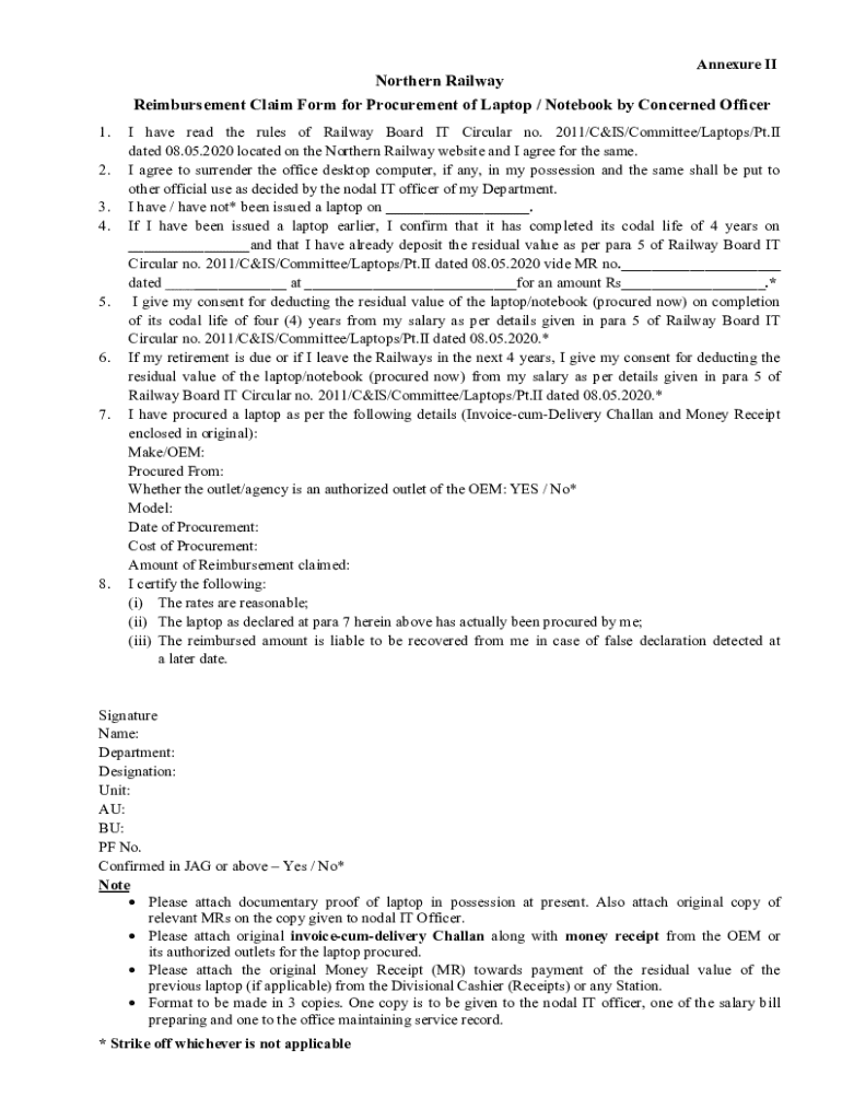 Get the free Northern Railway Reimbursement Claim Form for Procurement of ... - iritm indianrailw...