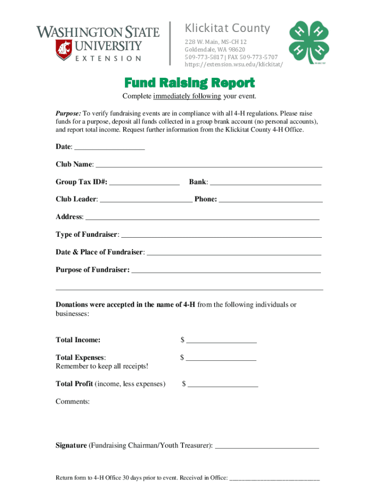 Klickitat County 228 W. Main, MSCH 12 Goldendale, WA 98620 5097735817 FAX 5097735707 https://extension.wsu.edu/klickitat/Fund Raising Report Complete immediately following your event. Purpose: To