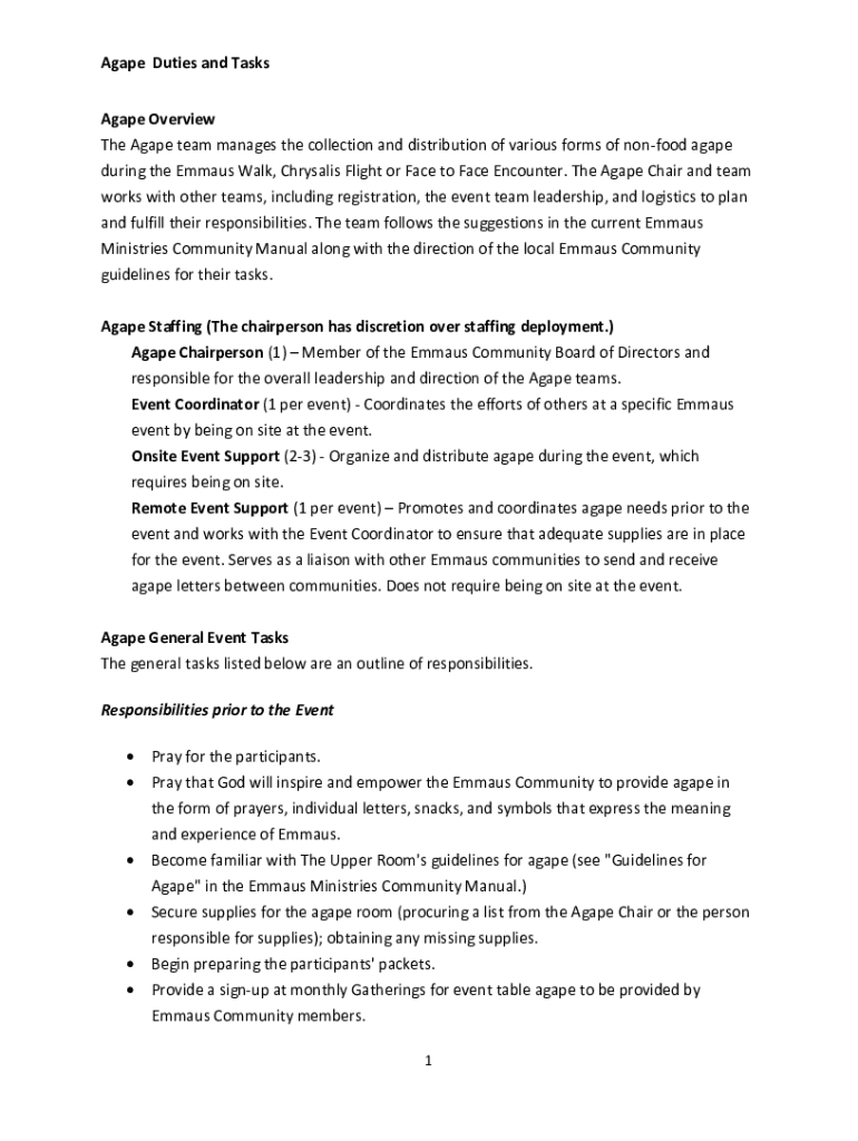Get the free Agape Duties and Tasks - Heart of Ohio Emmaus Ministries