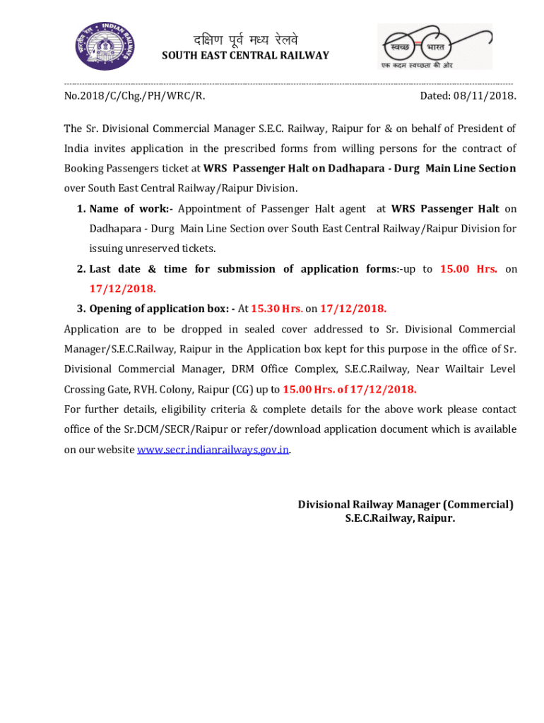 No.2018/C/Chg./PH/WRC/R. Dated: 08/11/2018. The Sr. Divisional Commercial Manager S.E.C. Railway, Raipur for & on behalf of President of