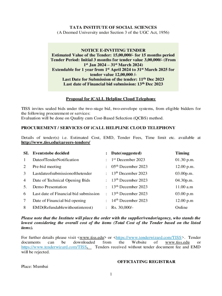 Estimated Value of the Tender: 15,00,000/ for 15 months period