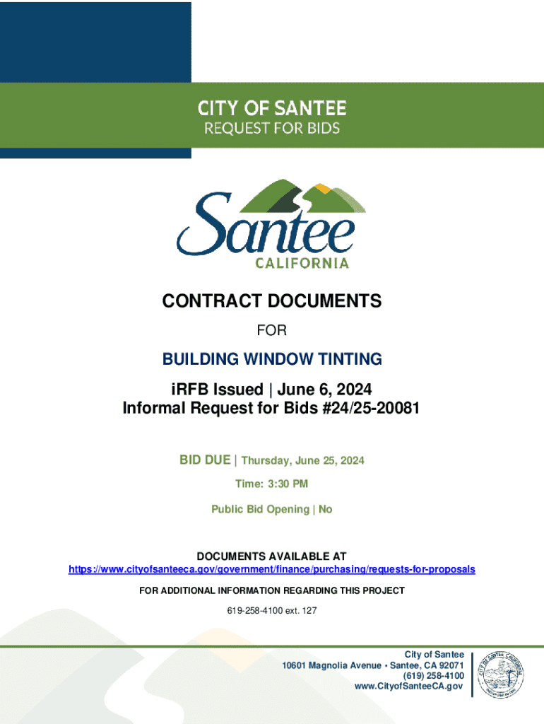 CONTRACT DOCUMENTS FORBIDDING WINDOW TINTING IRB Issued | June 6, 2024, Informal Request for Bids #24/2520081 BID DUE | Thursday, June 25, 2024 Time: 3:30 PM Public Bid Opening | Documents AVAILABLE