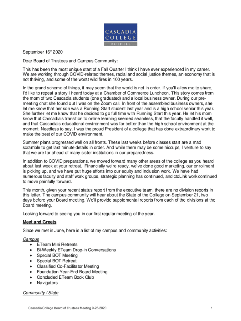 September 16th 2020 Dear Board of Trustees and Campus Community: This has been the unique start of a Fall Quarter I think I have ever experienced in my career. We are working through COVID related