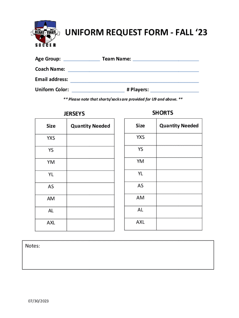 shorts/socks are provided for U9 and above. **SHORTSJERSEYS