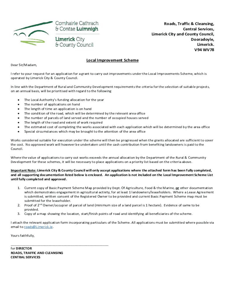 Roads, Traffic & Cleansing, Central Services, Limerick City and County Council, Dooradoyle, Limerick. V94 WV78 Local Improvement Scheme Dear Sir/Madam, I refer to your request for an application for