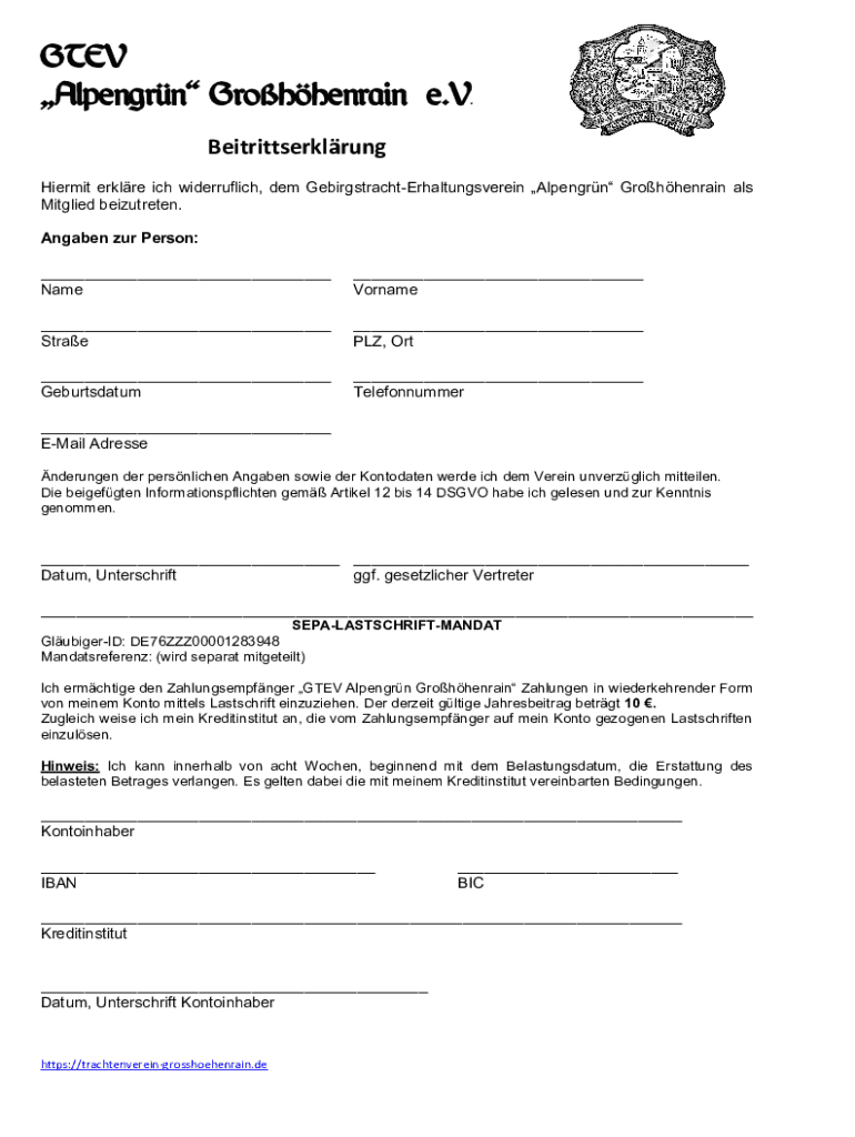 GTEV Alpengrn Grohhenrain e.V. Beitrittserklrung Hiermit erklre ich widerruflich, dem GebirgstrachtErhaltungsverein Alpengrn Grohhenrain als Mitglied beizutreten. Angaben zur Person: ___ Name___ Vorname___
