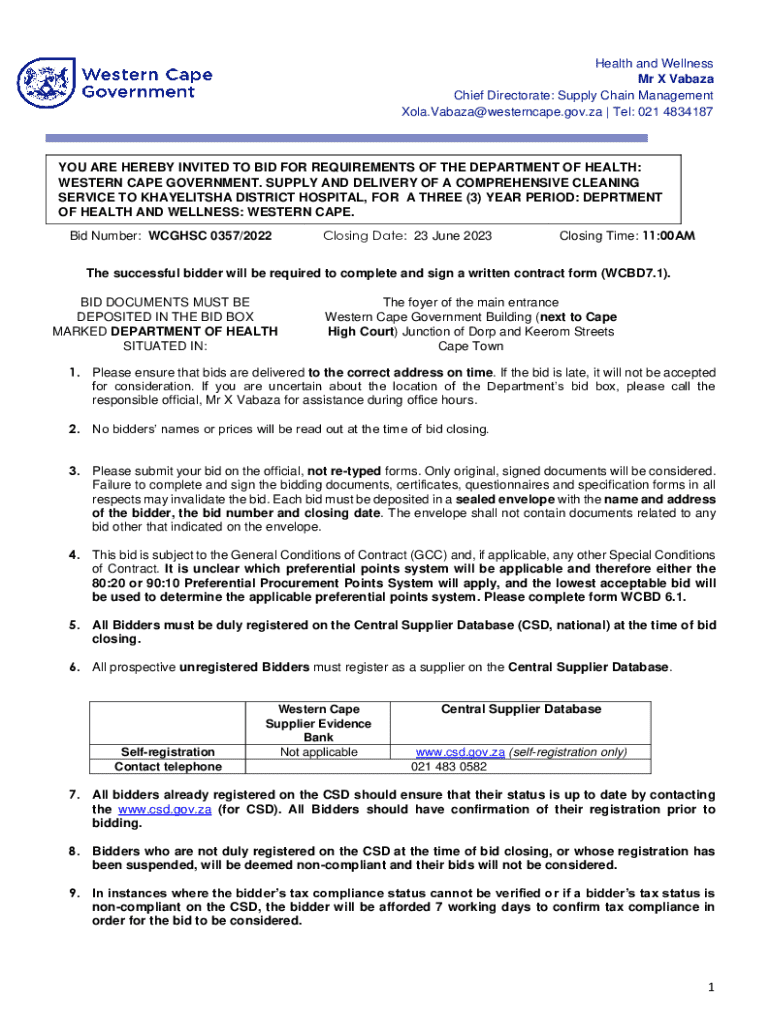 Xola.Vabaza@westerncape.gov.za | Tel: 021 4834187YOU ARE HEREBY INVITED TO BID FOR REQUIREMENTS OF THE DEPARTMENT OF HEALTH: