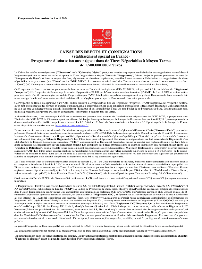 Prospectus de Base en date du 9 avril 2024CAISSE DES DEPTS ET CONSIGNATIONS (tablissement spcial en France) Programme d\'admission aux ngociations de Titres Ngociables Moyen Terme de 1.500.000.000