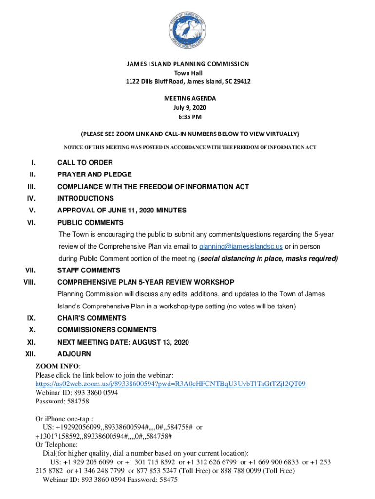 JAMES ISLAND PLANNING COMMISSION Town Hall 1122 Dills Bluff Road, James Island, SC 29412 MEETING AGENDA July 9, 2020 6:35 PM (PLEASE SEE ZOOM LINK AND CALLIN NUMBERS BELOW TO VIEW VIRTUALLY) NOTICE