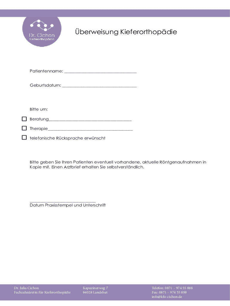 berweisung KieferorthopdiePatientenname: ___ Geburtsdatum: ___Bitte um: Beratung___ Therapie___ telefonische Rcksprache erwnschtBitte geben Sie Ihren Patienten eventuell vorhandene, aktuelle Rntgenaufnahmen