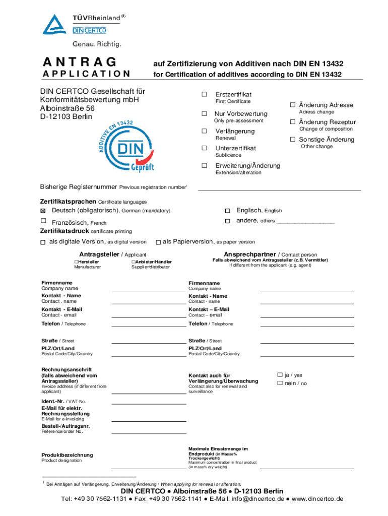 ANTRAGauf Zertifizierung von Additive each DIN EN 13432APPLICATIONfor Certification of additives according to DIN EN 13432DIN CER TCO Gesellschaft for
