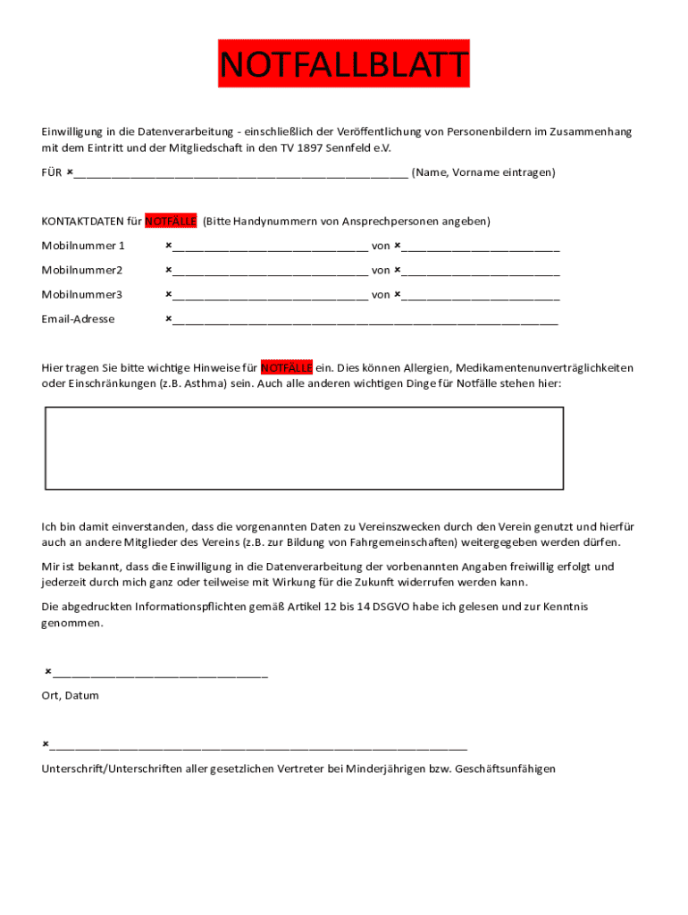NOTFALLBLATT Einwilligung in die Datenverarbeitung einschlielich der Verffentlichung von Personenbildern im Zusammenhang mit dem Eintritt und der Mitgliedschaft in den TV 1897 Sennfeld e.V. FR ___
