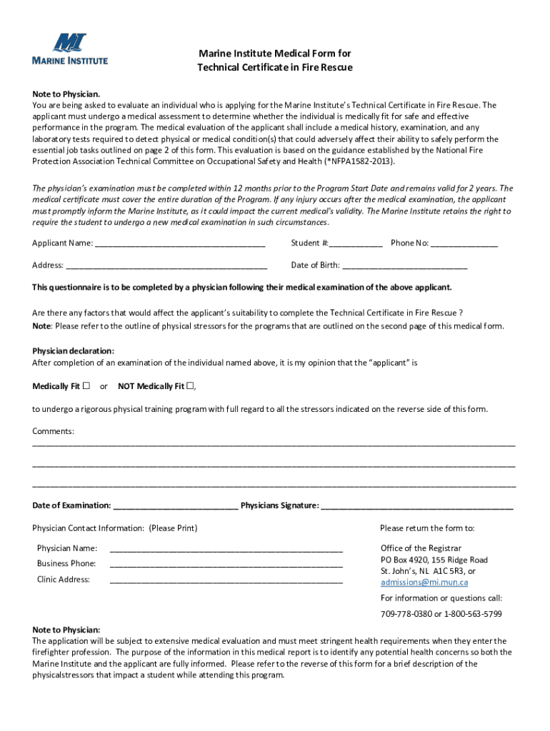 Marine Institute Medical Form for Technical Certificate in Fire Rescue Note to Physician. You are being asked to evaluate an individual who is applying for the Marine Institutes Technical Certificate