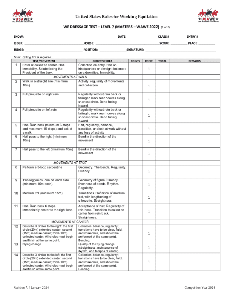 United States Rules for Working Equitation WE DRESSAGE TEST LEVEL 7 (MASTERS WAWE 2022)(1 of 2)SHOW: ___ DATE: ___ CLASS # ___ ENTRY # ___ RIDER: ___HORSE: ___SCORE: ___ PLACE: ___ JUDGE: ___ POSITION: