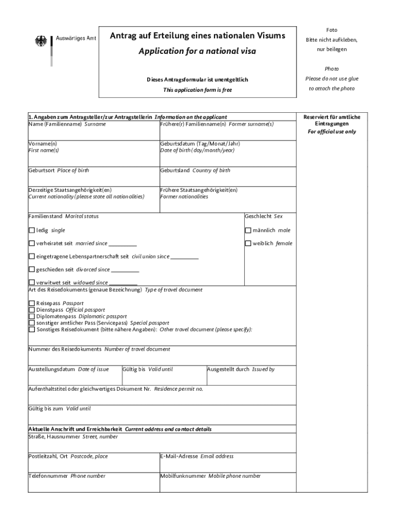 Antrag auf Erteilung eines nationalen Visums Application for a national visaFoto Bitte nicht aufkleben, nur beilegen PhotoDieses Antragsformular ist unentgeltlichPlease do not use glueThis application