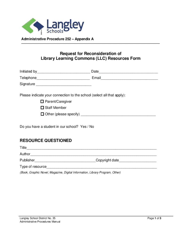 Administrative Procedure 252 Appendix ARequest for Reconsideration of Library Learning Commons (LLC) Resources Form Initiated by___ Date___ Telephone___ Email___ Signature ___ Please indicate your