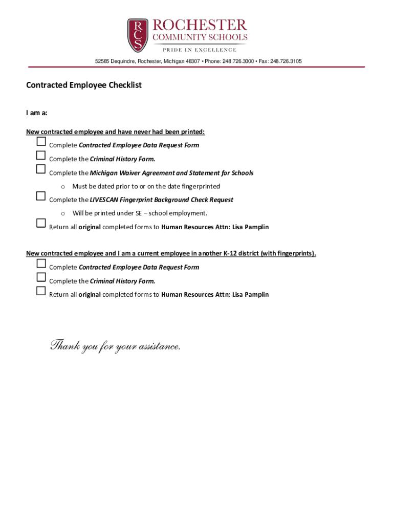 52585 Dequindre, Rochester, Michigan 48307 Phone: 248.726.3000 Fax: 248.726.3105Contracted Employee Checklist I am a: New contracted employee and have never had been printed: Complete Contracted Employee
