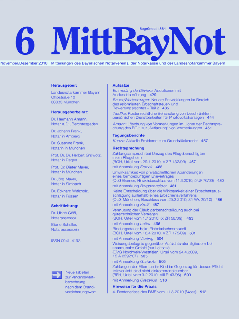 6 MittBayNot Begrndet 1864November/Dezember 2010 Mitteilungen des Bayerischen Notarvereins, der Notarkasse und der Landesnotarkammer BayernHerausgeber: Landesnotarkammer Bayern Ottostrae 10 80333